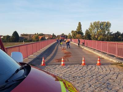 Kurze Zeit später heulten auch schon die Sirenen. Das erste Alarmstichwort lautete „Auslaufende Betriebsstoffe“ auf der Elsterbrücke in Raßnitz.