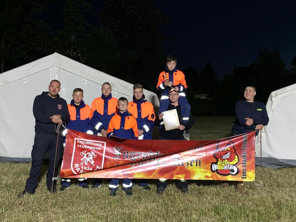 Alles fing am Freitagnachmittag an. Während die Kameraden aus Altentreptow eine mehrstündige Autofahrt antraten, war in Großkugel der Aufbau des Zeltlagers bereits abgeschlossen. Nach Ankunft galt es zunächst die Liegen aufzubauen und alles für das Wochenende durchzusprechen. In den späten Nachmittagsstunden konnte dann das Freundschaftszeltlager feierlich eröffnet werden. Kurze Zeit später schloss sich daran schon das erste Highlight an. Durch Unterstützung der aktiven Kameradinnen und Kameraden wurde eine Nachtwanderung vorbereitet, wo die Jugendlichen durch Wissen und Können nicht nur in der kleinen Lagerolympiade antraten. Gleichermaßen konnten alle jungen Teilnehmer die „Jugendflamme Stufe I“ erwerben, welche ihr feuerwehrtechnisches Know-how bescheinigt.